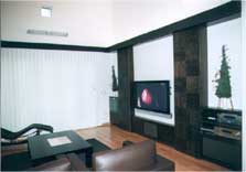 新築リビングシアター 天井が吹き抜けでプロジェクターの設置スペースが無いため幕板を作りプロジェクターを設置、リアスピーカーを埋め込みました。お部屋もカッシーナの家具で統一されAVボード等リビング全体の雰囲気も良くなっています。