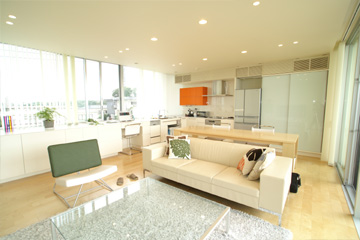 | 【新築物件リビングルーム】 AV機器は全て右カウンターの中に全て隠しました。(遠隔受光システムでリモコン操作可能です) フロントスピーカーは天井に埋め込みました。 |