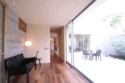 広々としたテラス臨むエントランス。おもてなしのファニチャーとBGMが出迎えてくれます。