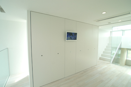 プロジェクターは吹き抜けの壁面の埋め込んで設置しました。 |